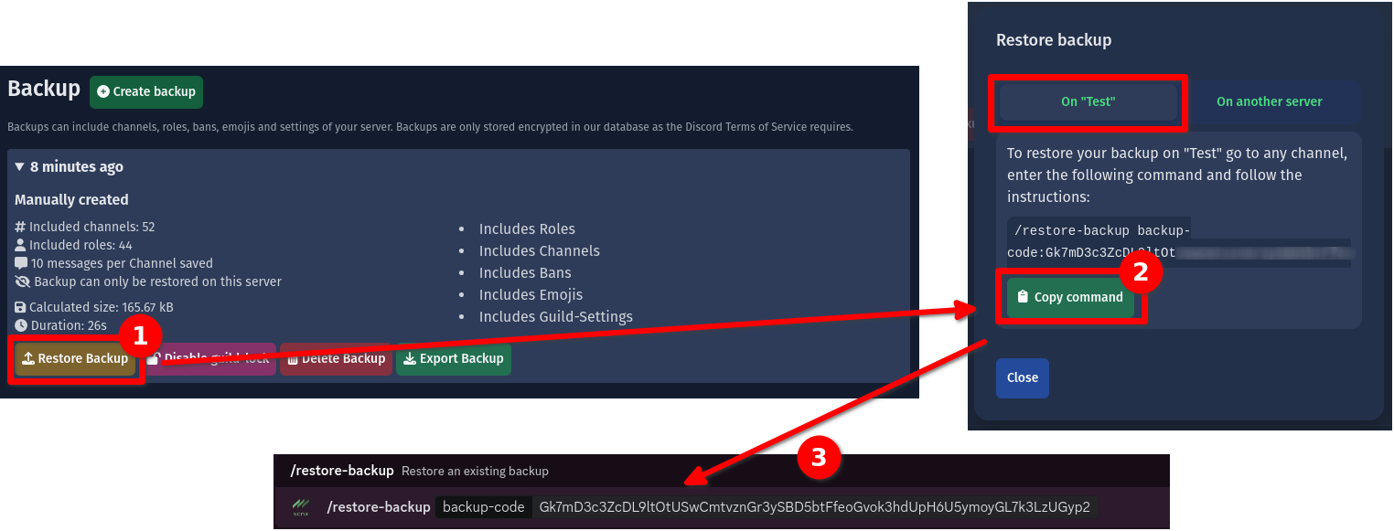 To restore a backup on your server, visit the backup dashboard of your server and click on the backup you want to restore. Next, click on "Restore backup". You'll be shown a command. Use the "Copy command" button to copy the command and paste it into Discord on your server. Make sure that you are executing this command with the (verified) SCNX-Bot.